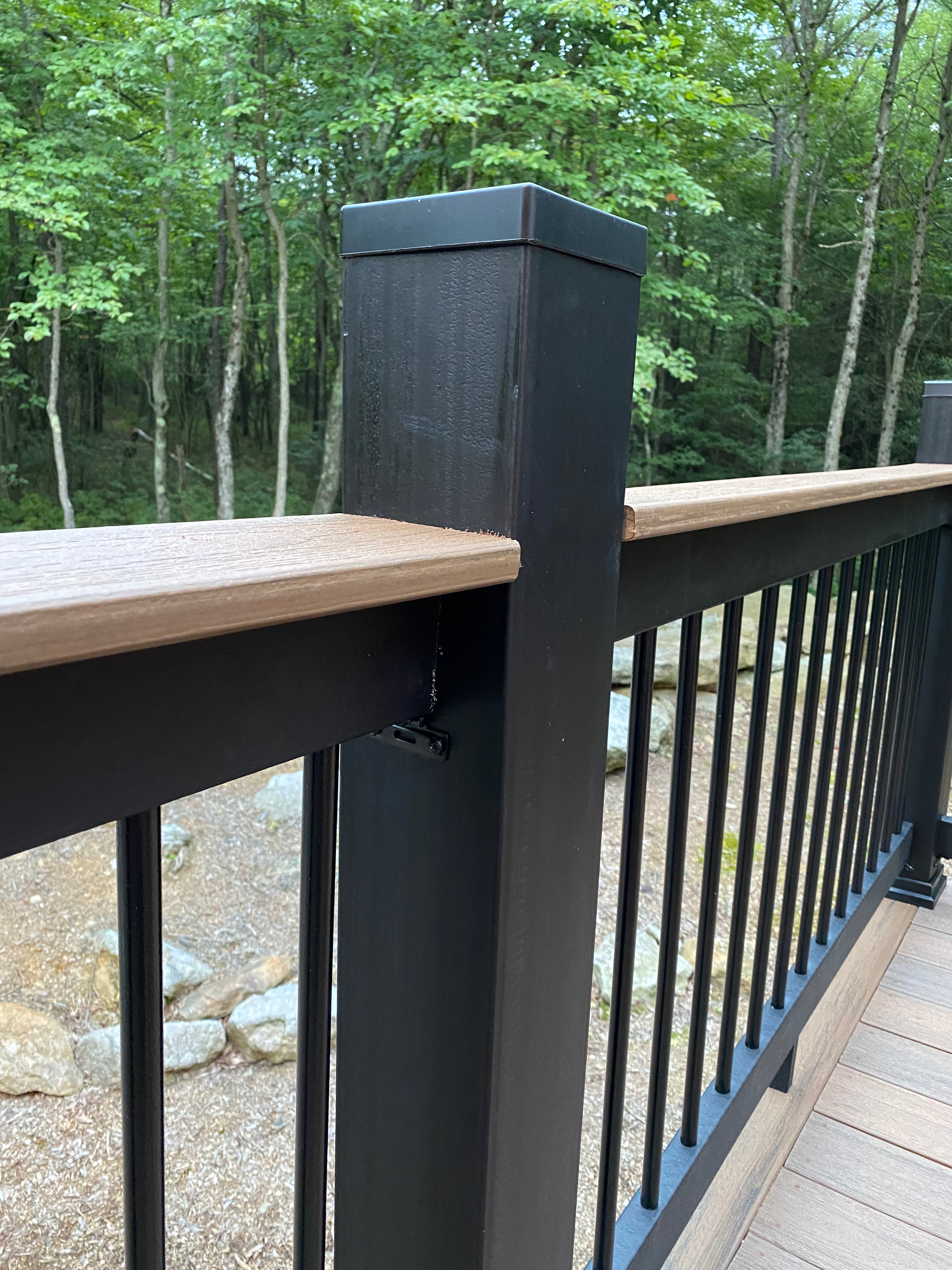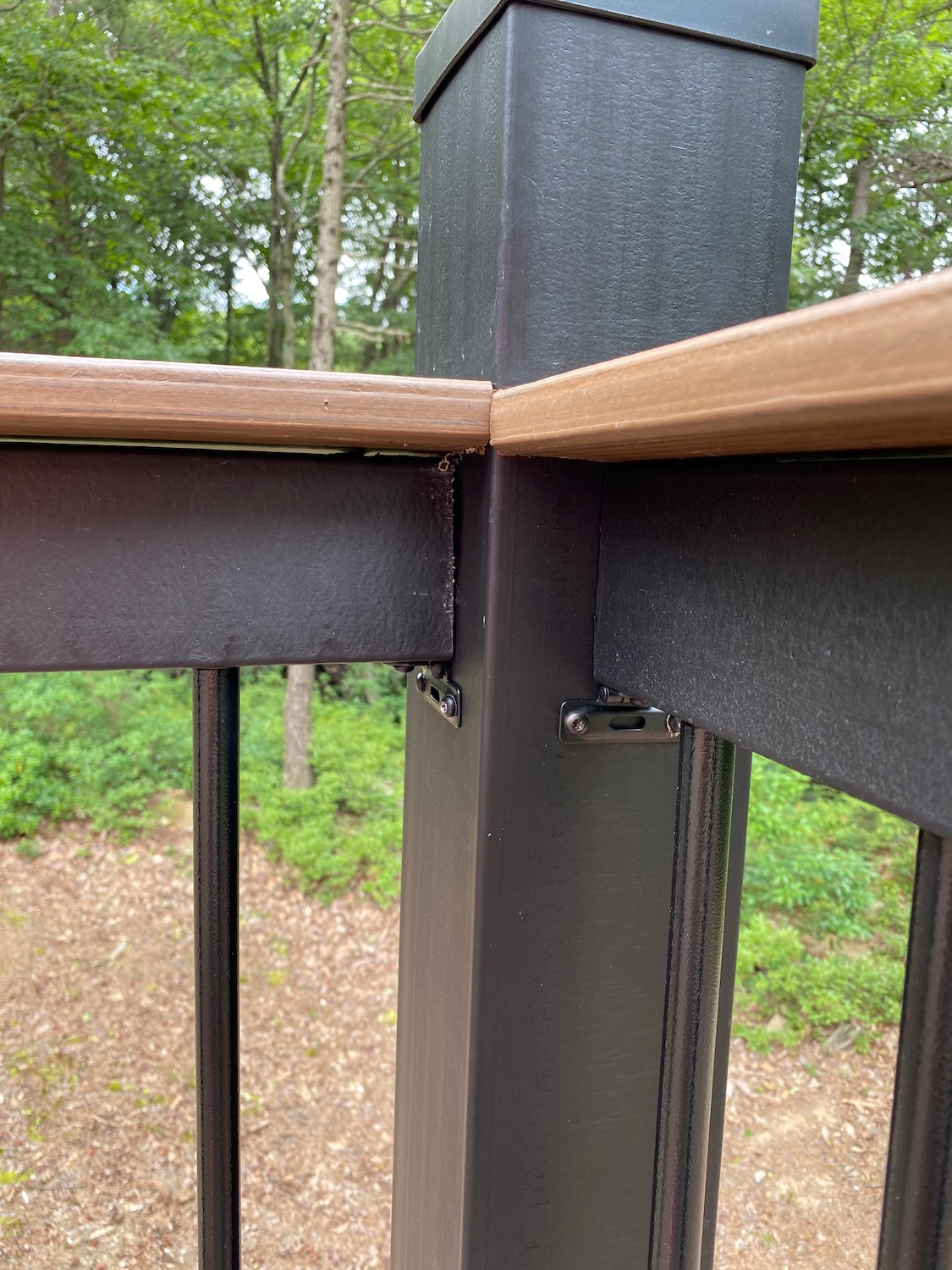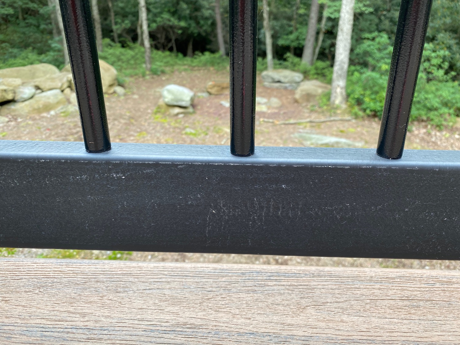 Bottom railing board is scuffed / discolored (does not wipe off). Second section from left across from house.